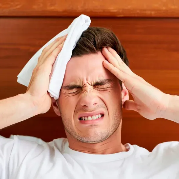 Это симптомокомплекс, возникающий через некоторое время после употребления алкоголя. Характеризуется сочетанием различных отклонений в физическом и психическом состоянии. Человек страдает от головной боли, утомляемости, мышечных болей (миалгии), жажды, повышенного артериального давления. Это состояние развивается из-за токсического влияния веществ, которые образуются при распаде алкоголя, особенно ацетальдегида, который в 10–30 раз опаснее этанола.